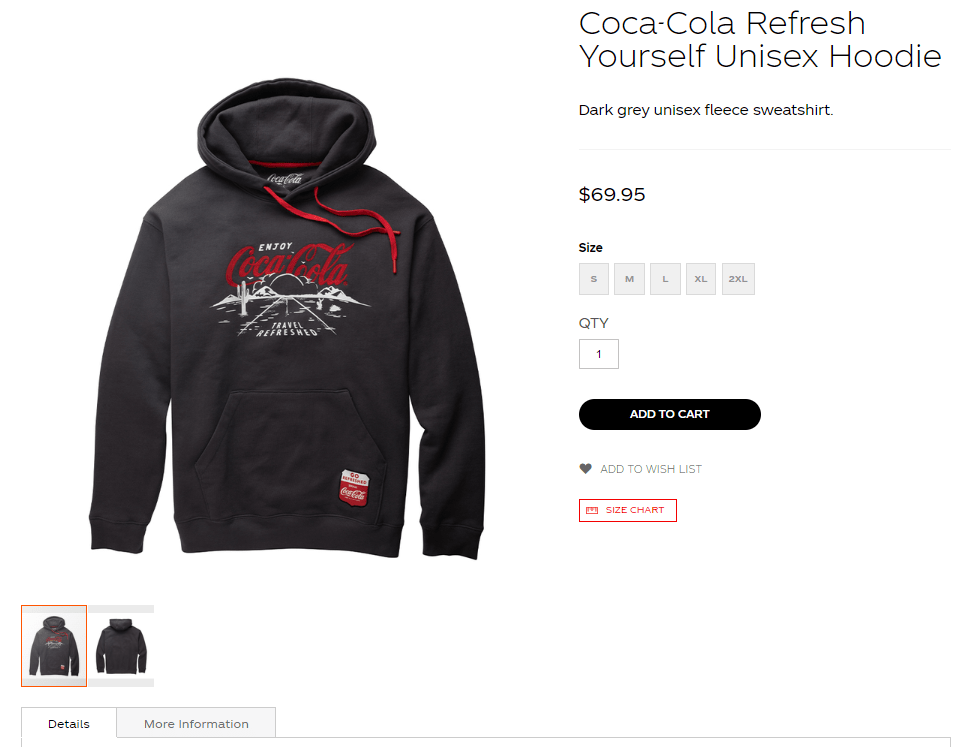This brand also uses Adobe Commerce. Their product tabs are transparent and functional. Customers have easy access to all the data they need. You can read not just the product information but also benefit from suggestions of other products in Coca-Cola’s offer.