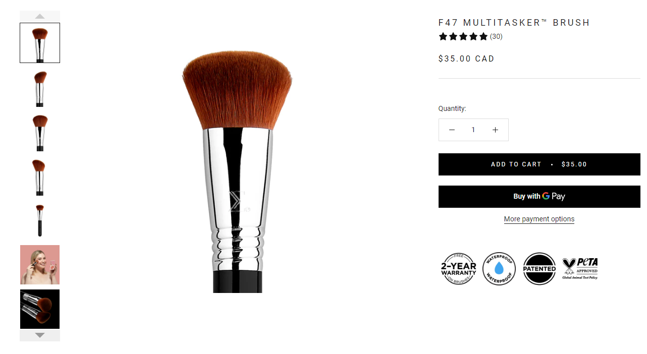 This company sells cosmetics, and their product cards are just fantastic. They use not only high-quality product photos but also video tutorials, and detailed product descriptions. There are also customer reviews under each tab.
